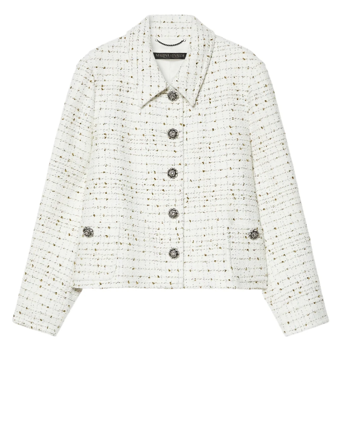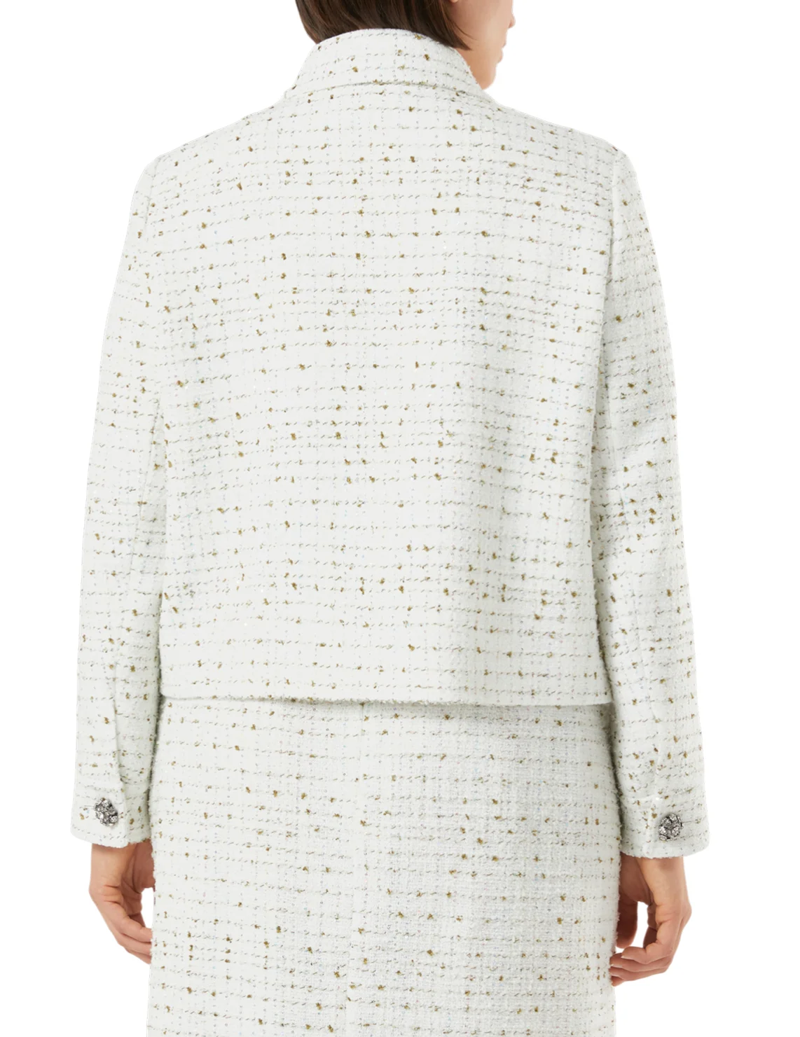 Жакет изготовлен из полиэстера, акрила, хлопка и полиамида. Модель выполнена в прямом крое. Имеет отложной воротник, застежку на пуговицах, накладные карманы и длинные рукава с манжетами. Декорирован пайетками и принтом в клетку, а пуговицы - стразами.