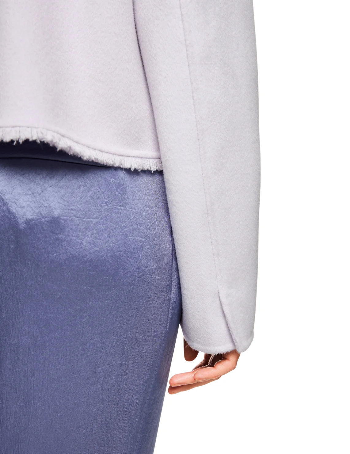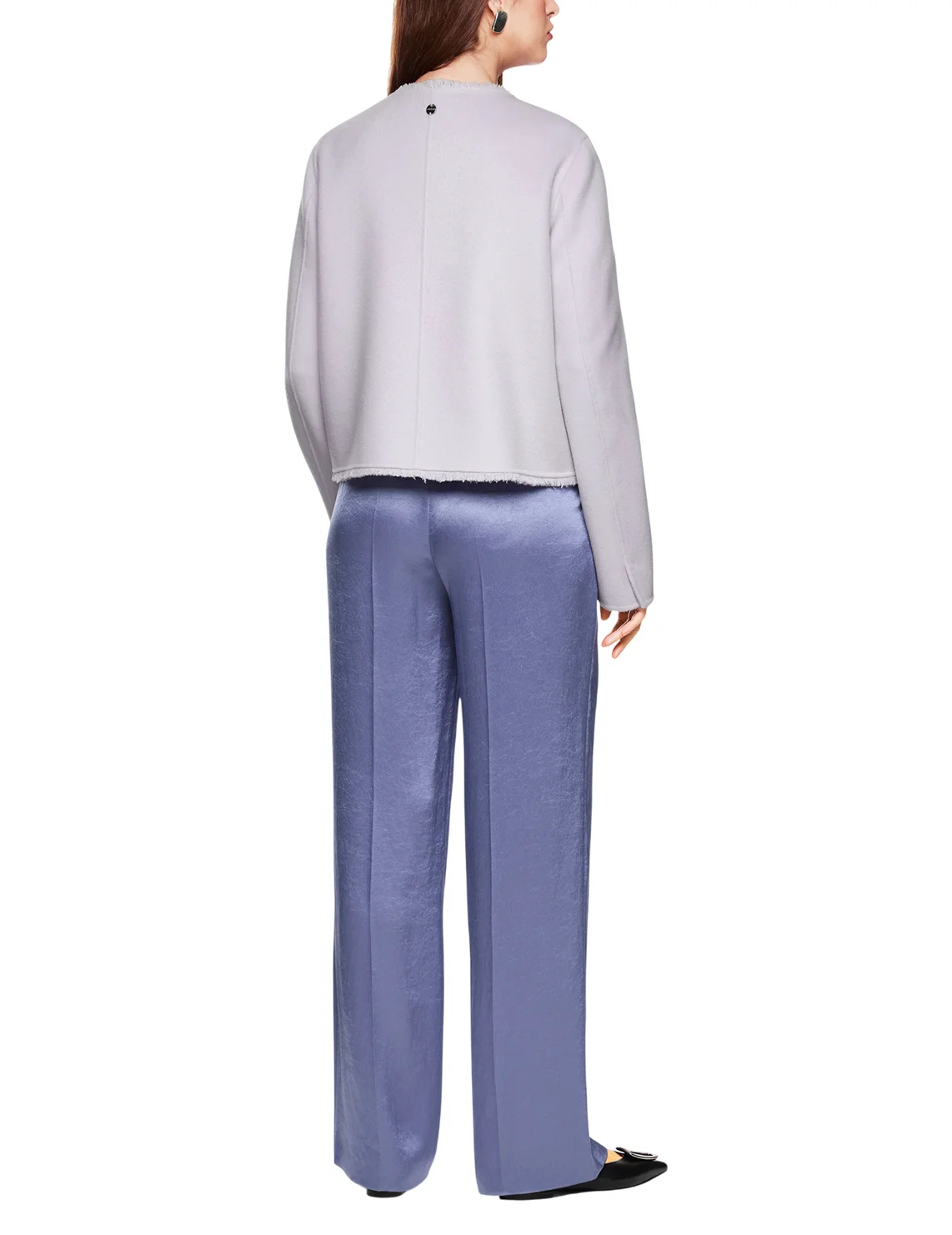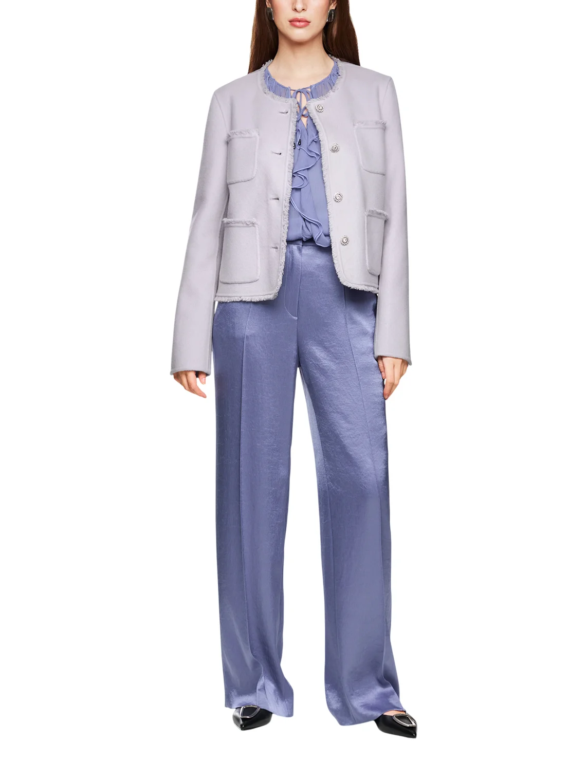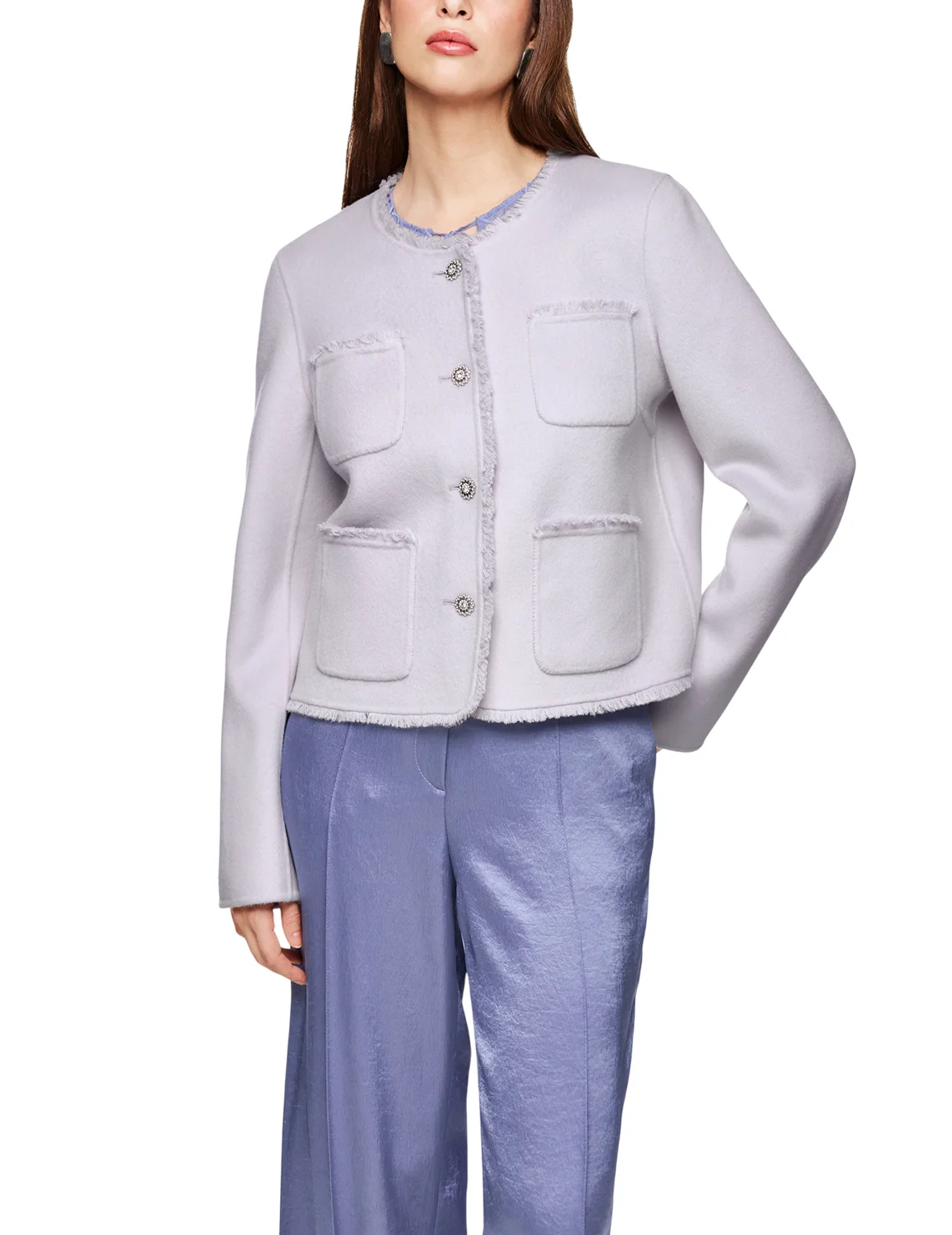 Жакет изготовлен из шерсти высокого качества. Модель выполнена в прямом крое. Имеет круглый вырез горловины, застежку на пуговицах, длинные рукава и накладные карманы. Декорирован бахромой.