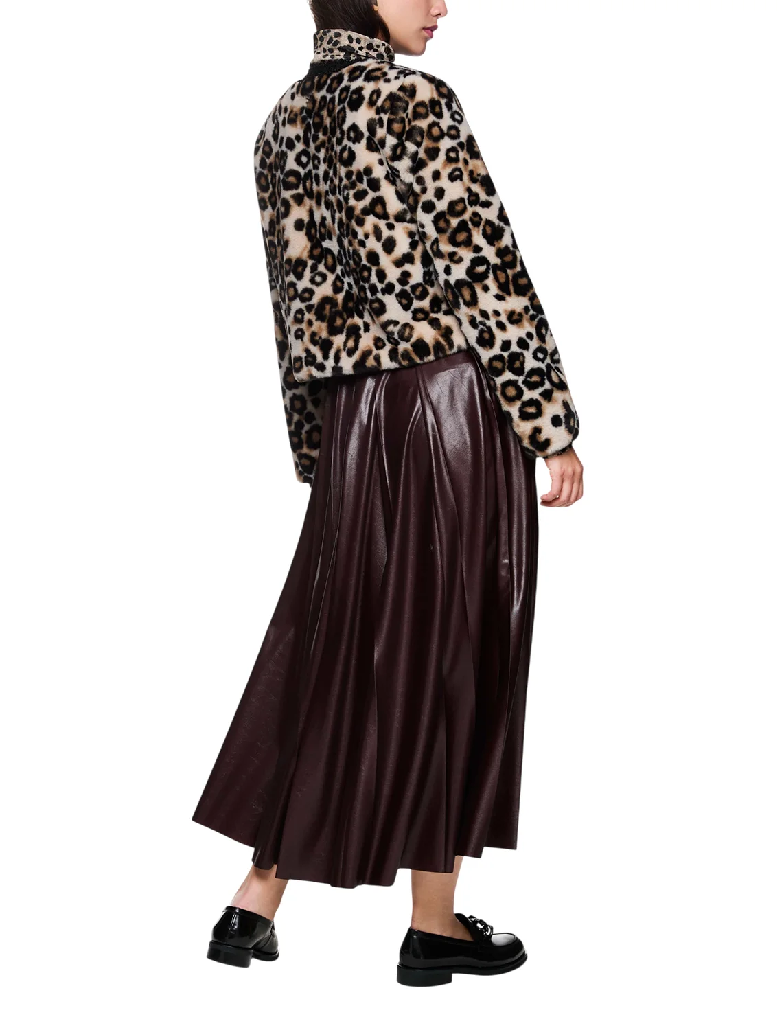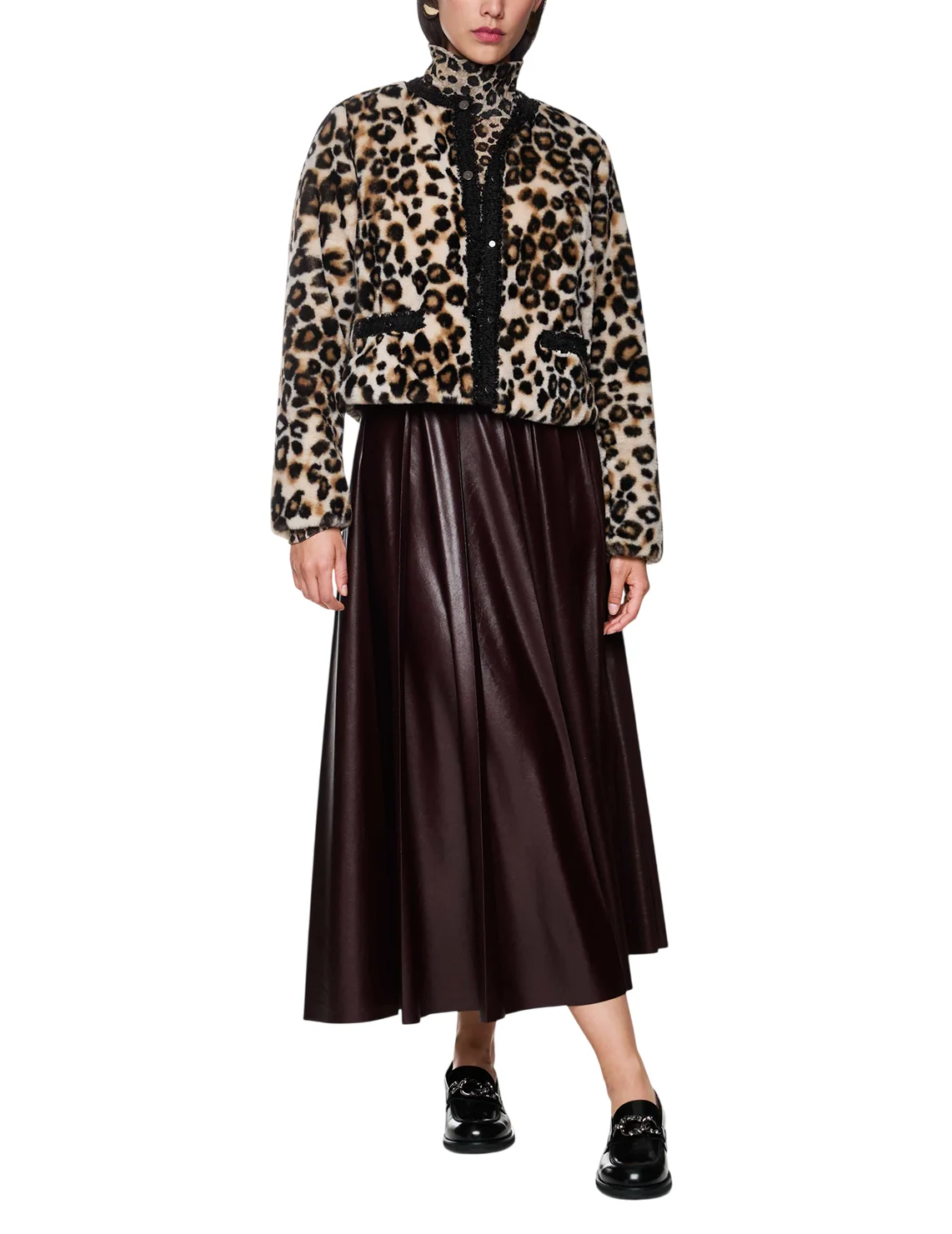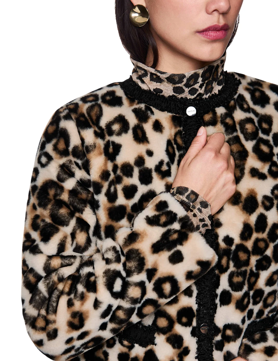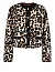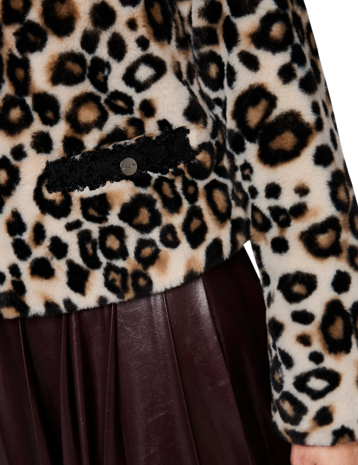 Жакет изготовлен из полиэстера. Модель выполнена в прямом крое. Имеет круглый вырез горловины, застежку на кнопках, длинные рукава и прорезные карманы. Декорирован бахромой и анималистичным принтом.