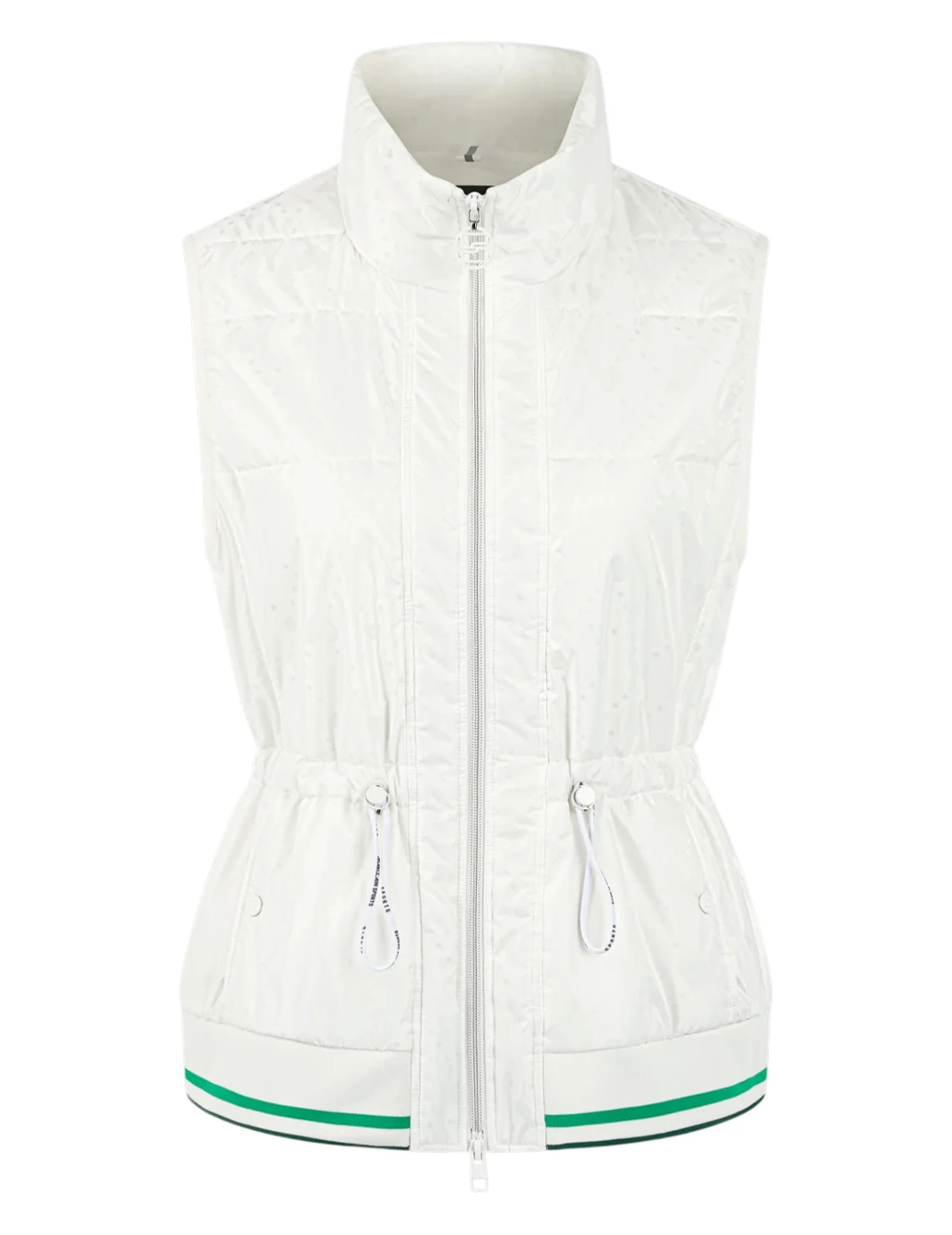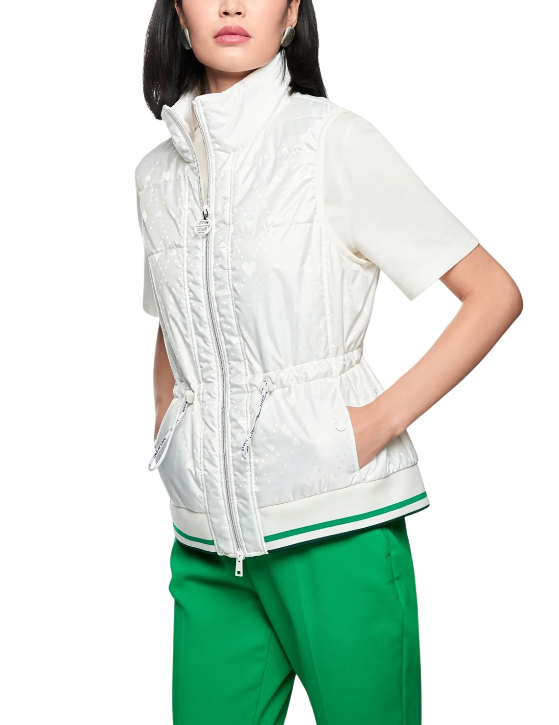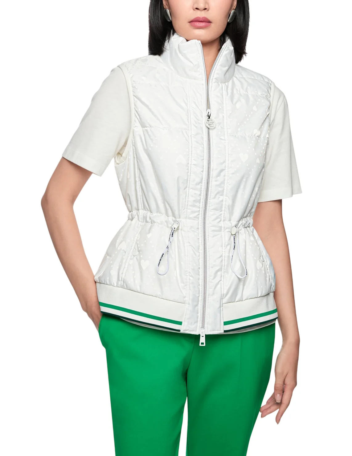 Жилет изготовлен из полиамида и полиэстера, подкладка из полиамида, наполнитель из полиэстера. Модель приталенного кроя. Имеет воротник-стойку, два прорезных кармана на кнопках, кулиску на талии и двустороннюю застежку-молнию. Декорирован оригинальным принтом.
