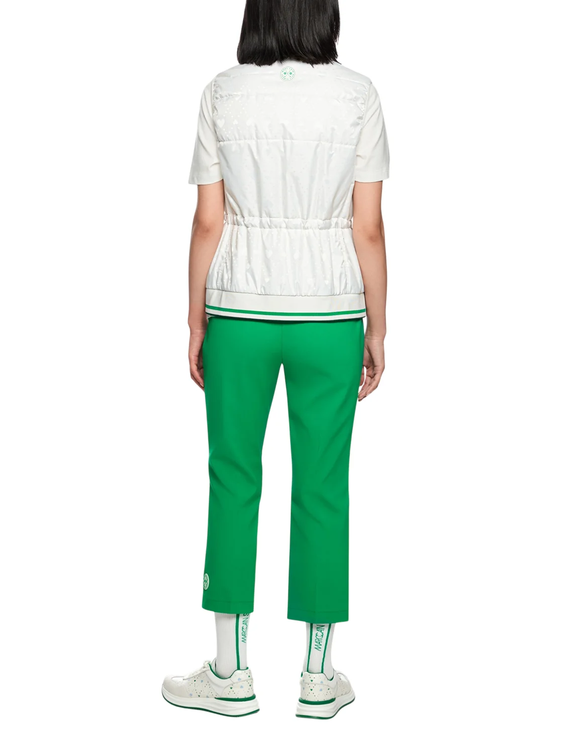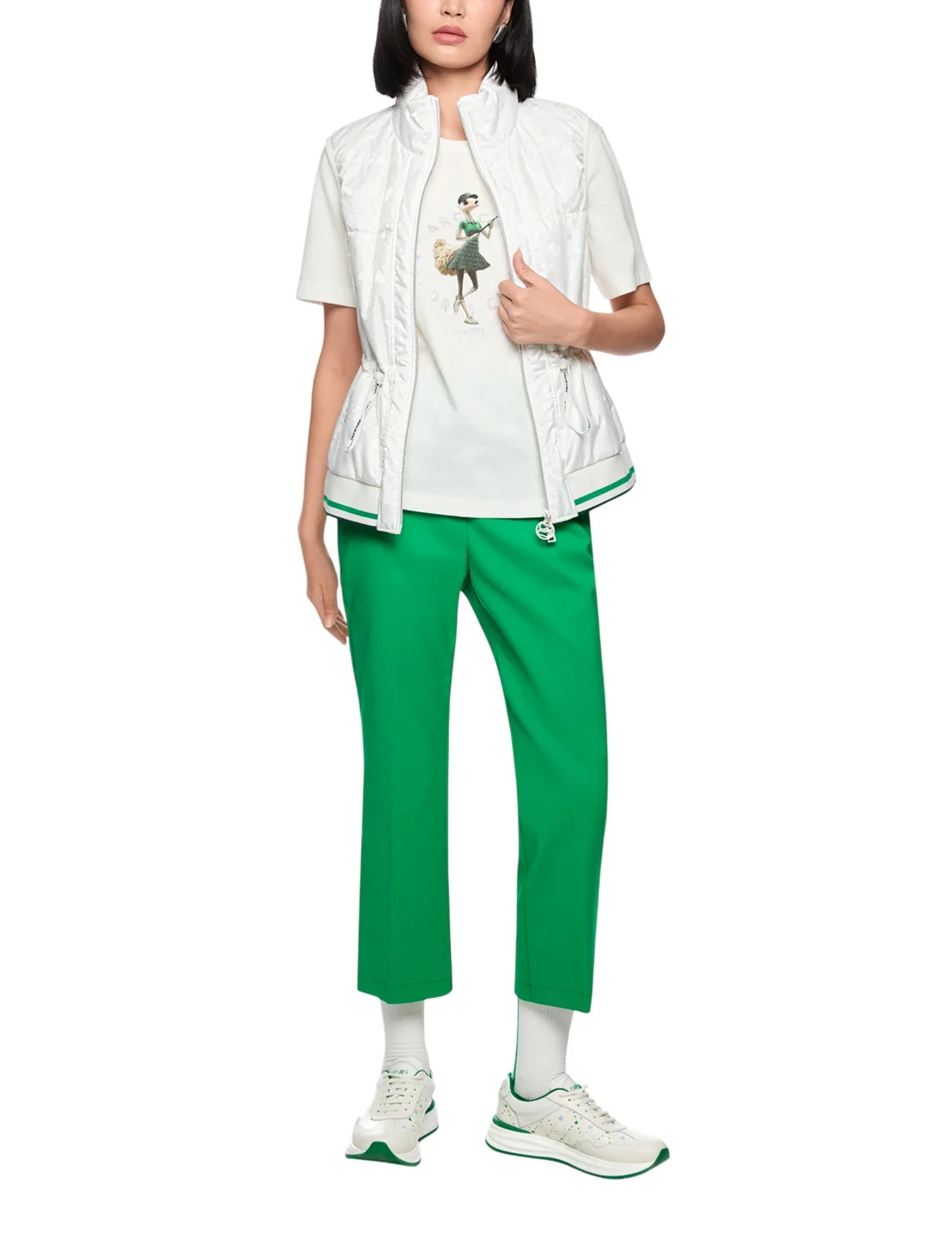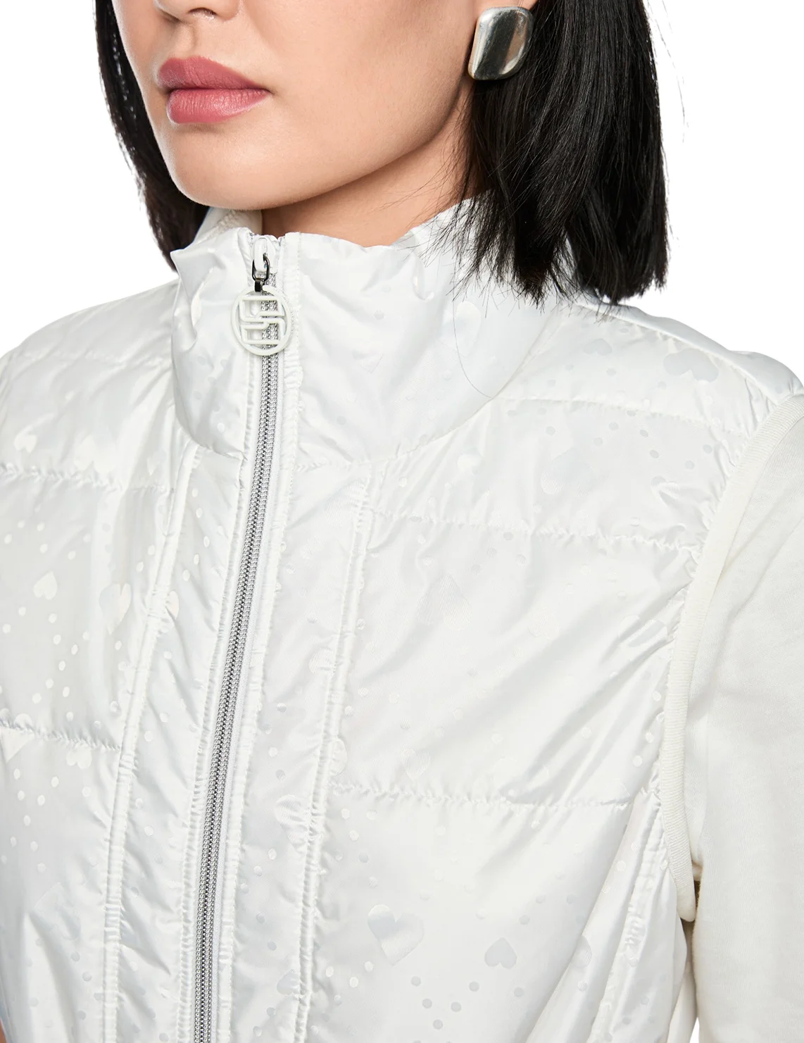 Жилет изготовлен из полиамида и полиэстера, подкладка из полиамида, наполнитель из полиэстера. Модель приталенного кроя. Имеет воротник-стойку, два прорезных кармана на кнопках, кулиску на талии и двустороннюю застежку-молнию. Декорирован оригинальным принтом.