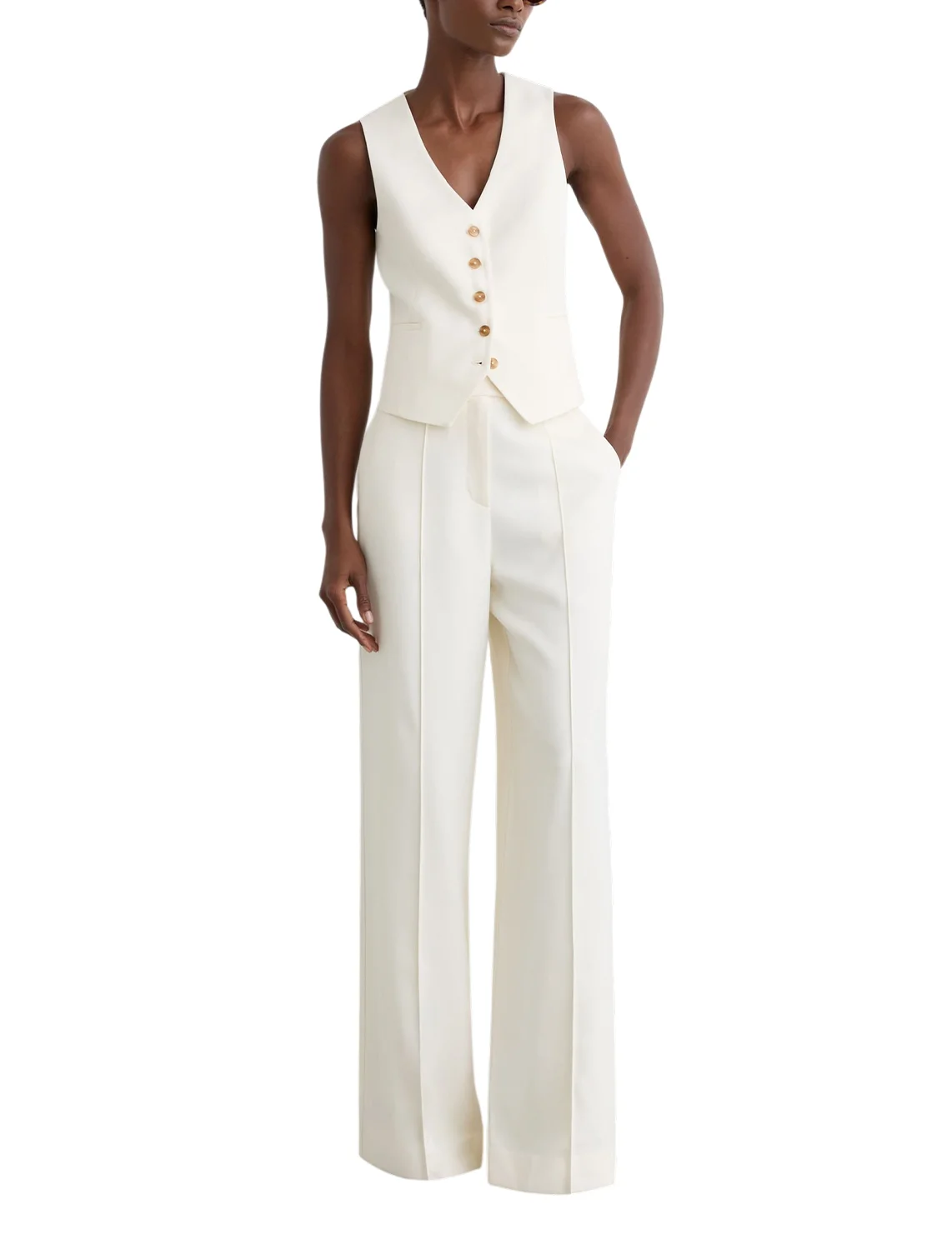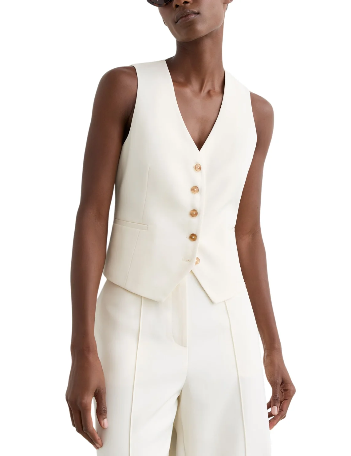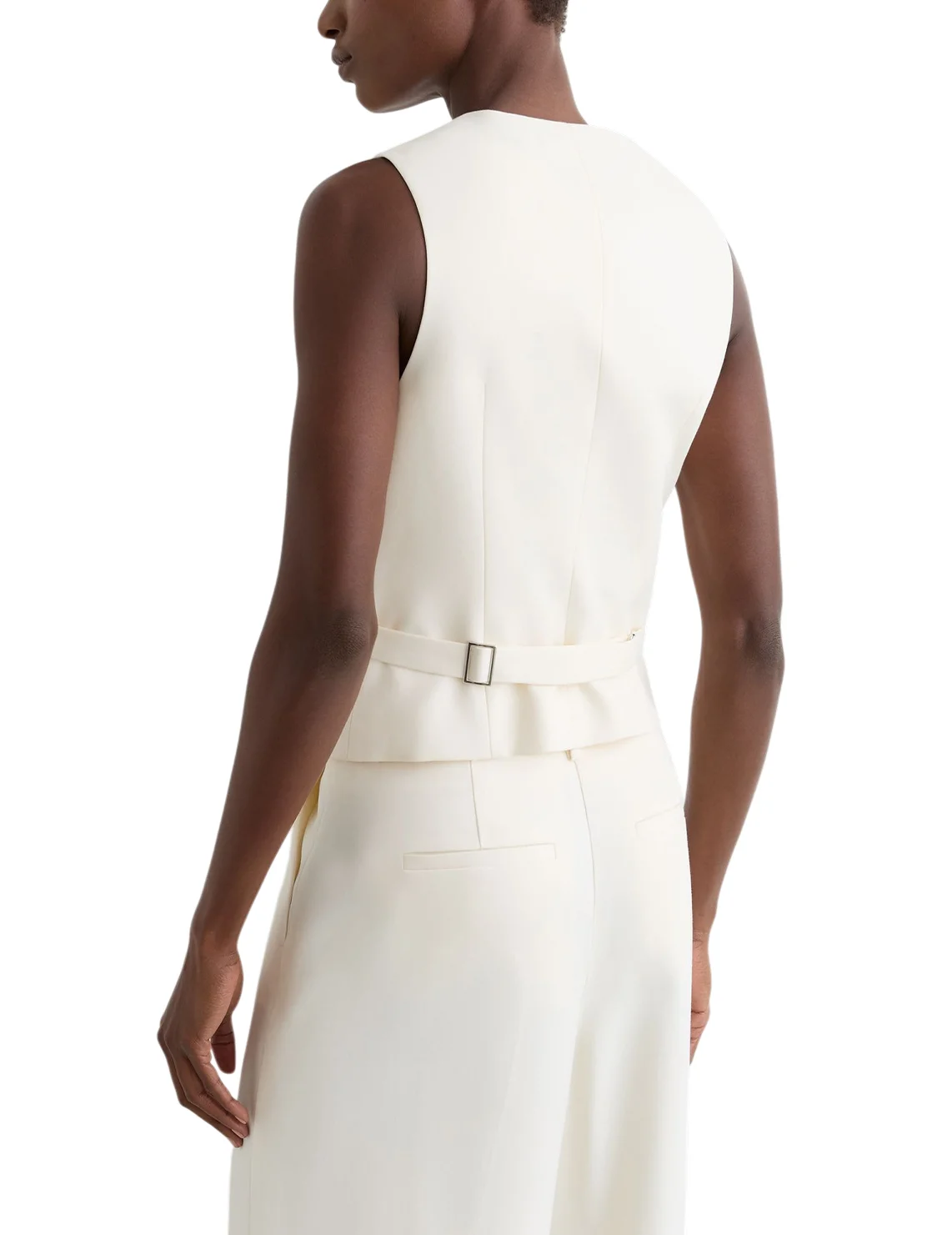 Жилет изготовлен из вискозы и полиэстера. Модель выполнена в приталенном крое. Имеет V-образный вырез горловины, регулируемый пояс сзади, застежку на пуговицах и боковые прорезные карманы.