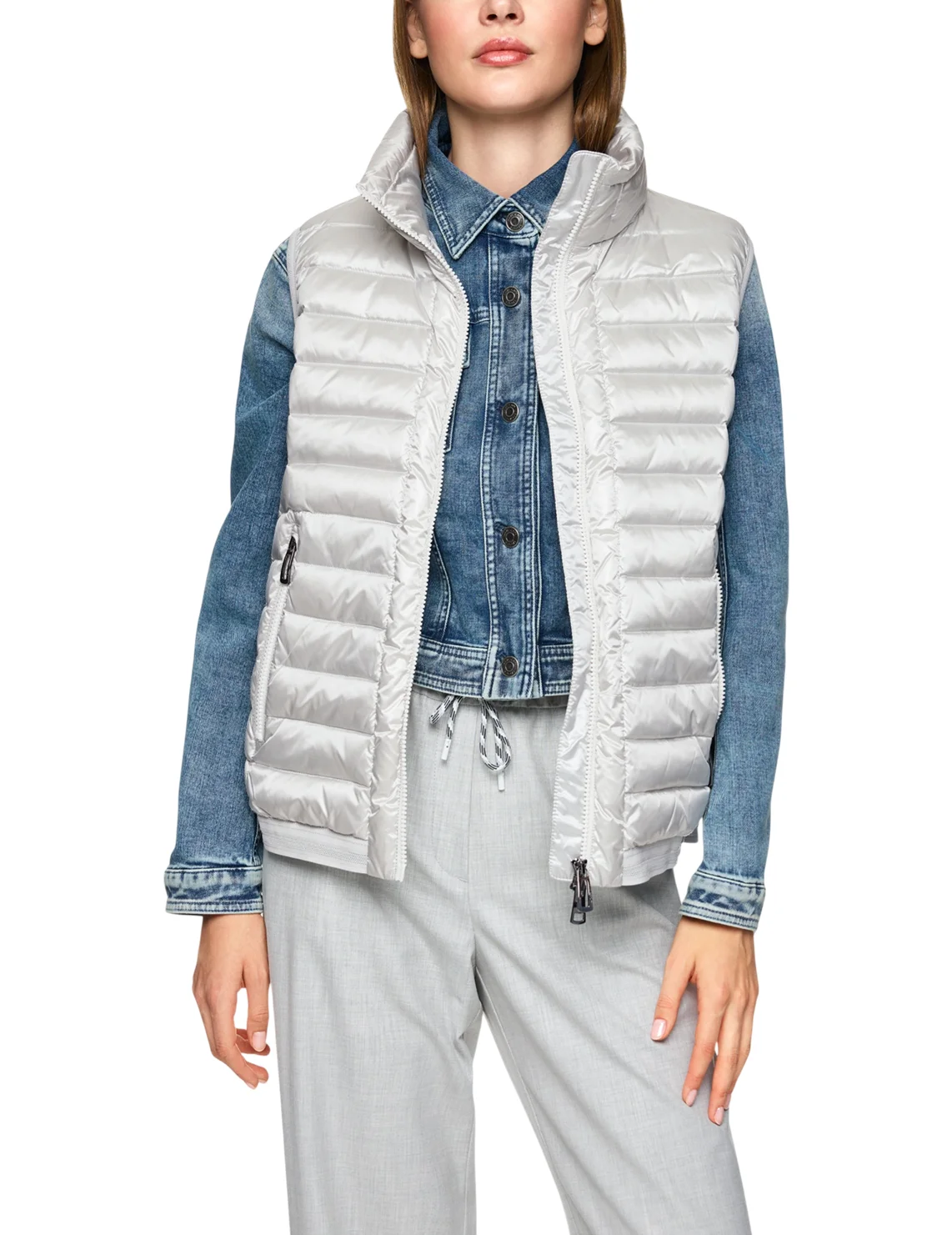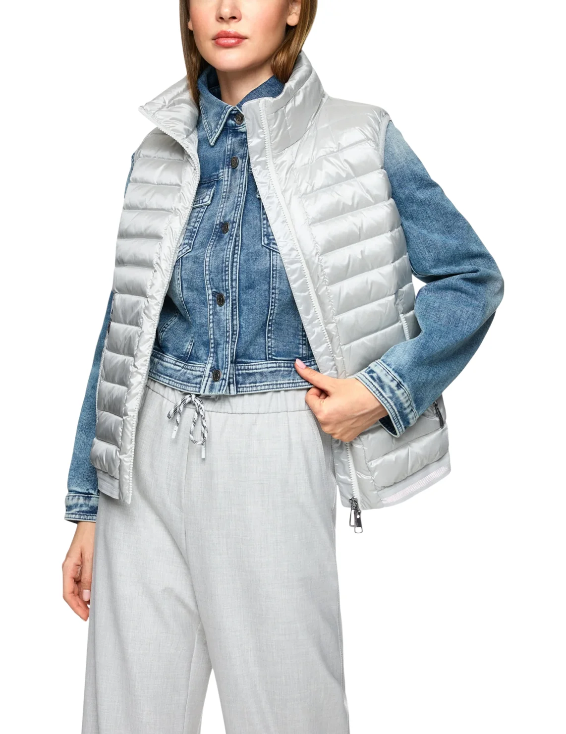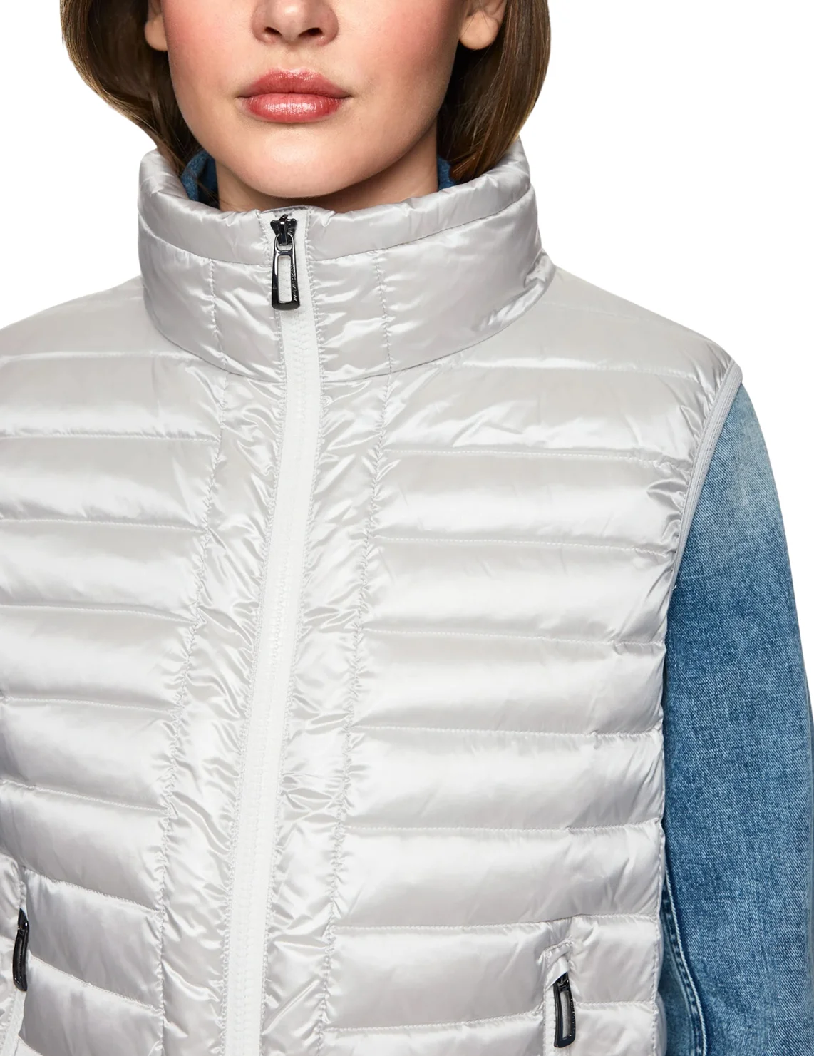Жилет изготовлен из полиэстера и полиамида, наполнитель - пух, перо. Модель прямого кроя. Имеет воротник-стойку, два прорезных кармана на молнии и двустороннюю застежку-молнию.