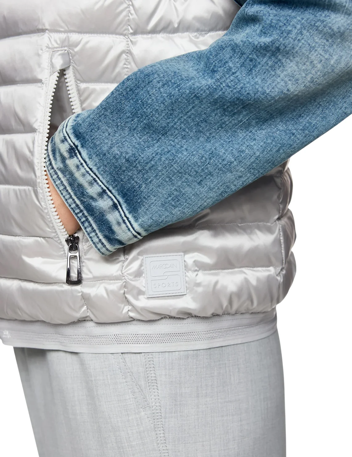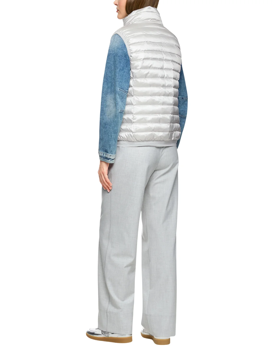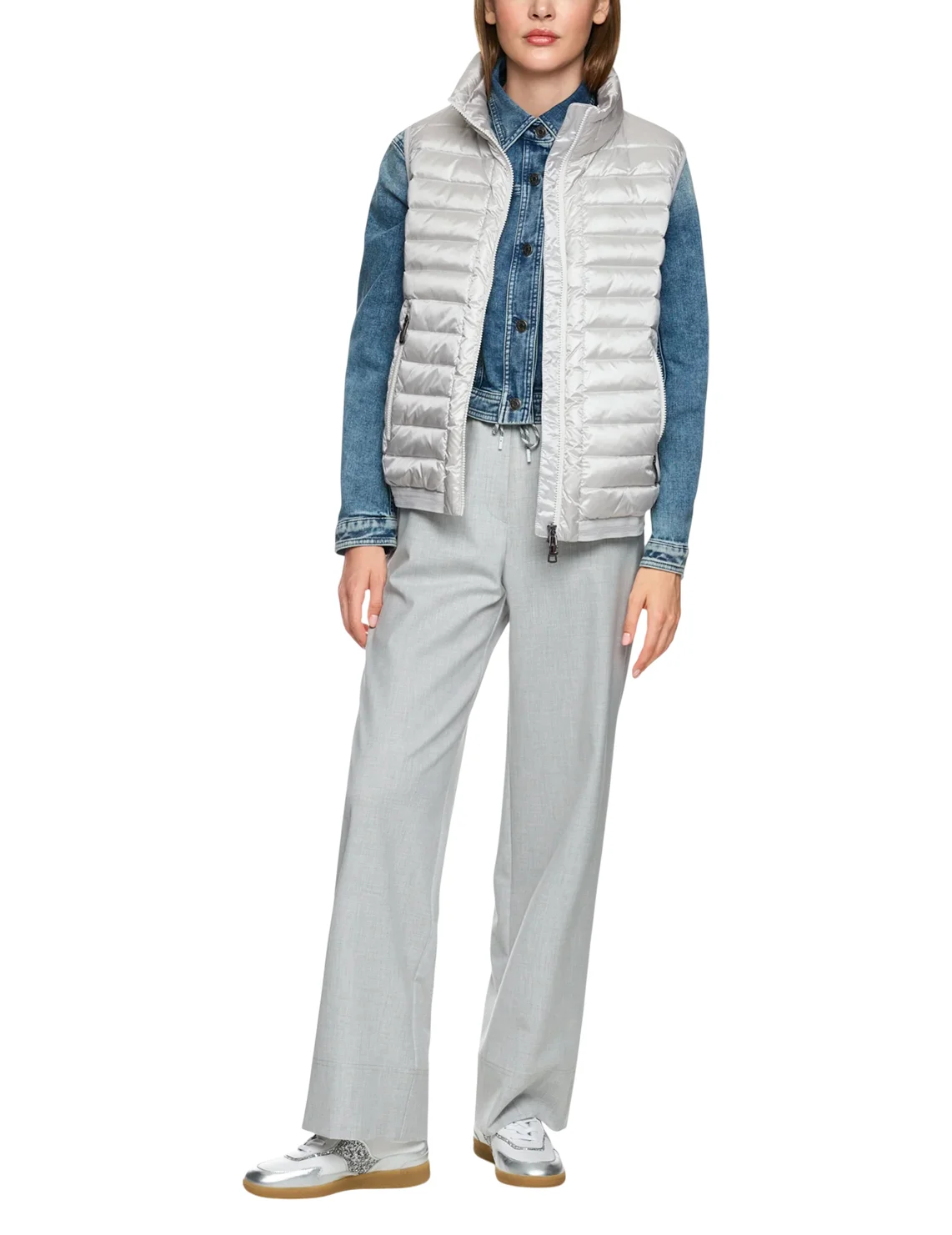 Жилет изготовлен из полиэстера и полиамида, наполнитель - пух, перо. Модель прямого кроя. Имеет воротник-стойку, два прорезных кармана на молнии и двустороннюю застежку-молнию.