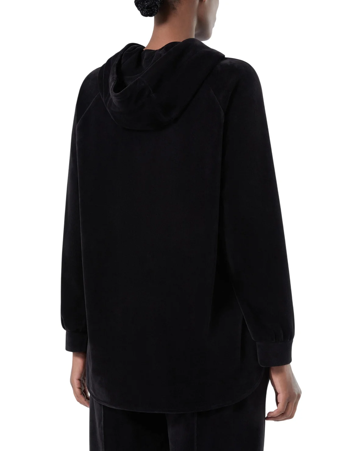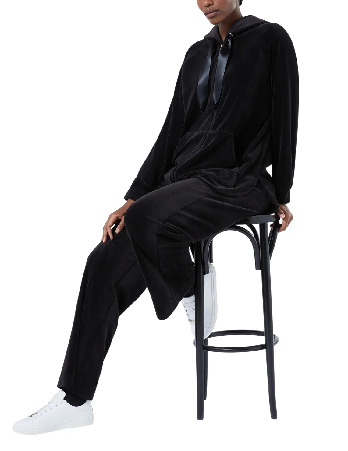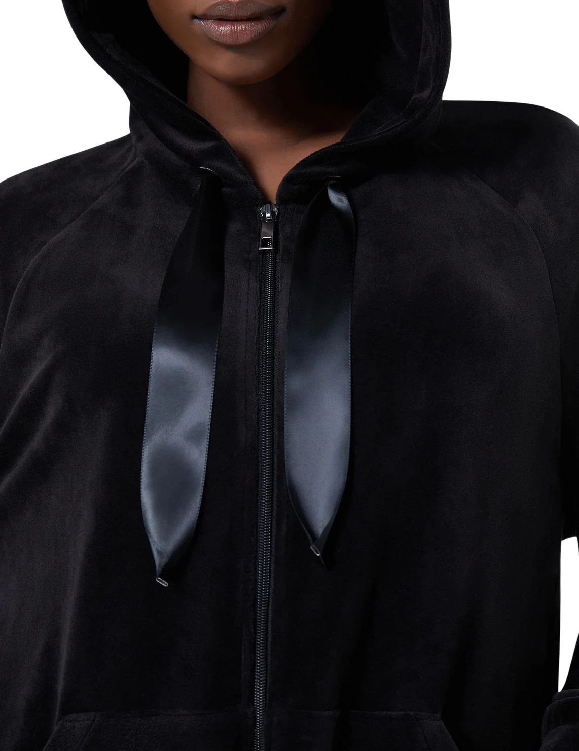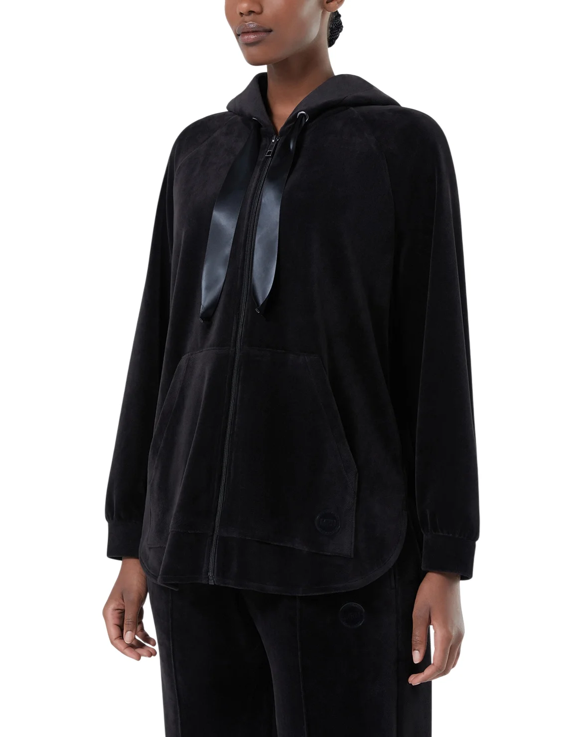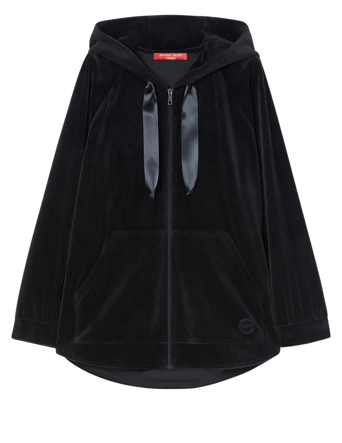 Зип-худи изготовлено из полиэстера и эластана. Модель выполнена в прямом крое. Имеет воротник-стойку с кулиской, капюшон, застежку на молнии, накладные карманы и длинные рукава с манжетами.